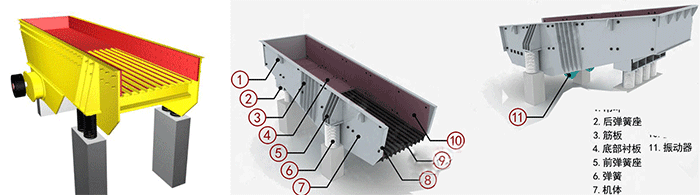 振動給料機(jī)是利用振動器中的偏心塊旋轉(zhuǎn)產(chǎn)生離心力,使篩廂、振動器等可動部分作強制的連續(xù)的圓或近似圓的運動。振動給料機(jī)是由給料槽體、激振器、彈簧支座、傳動裝置等組成。槽體振動給料的振動源是激振器,激振器是由兩根偏心軸(主、被動)和齒輪副組成,由電動機(jī)通過三角帶驅(qū)動主動軸,再由主動軸上齒輪嚙合被動軸轉(zhuǎn)動,主、被動軸同時反向旋轉(zhuǎn),使槽體振動,使物料連續(xù)不斷流動,達(dá)到輸送物料的目的。